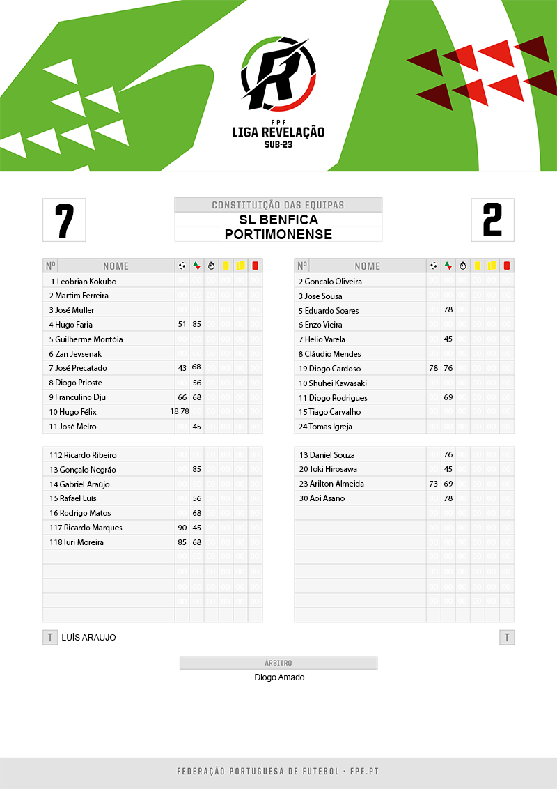 7 - 2, foi o resultado da primeira partida deste domingo, os Sub-23 jogaram contra o SL Benfica em jogo referente à 1.ª jornada da Série D do Torneio de Abertura da Liga Revelação 2022/23.